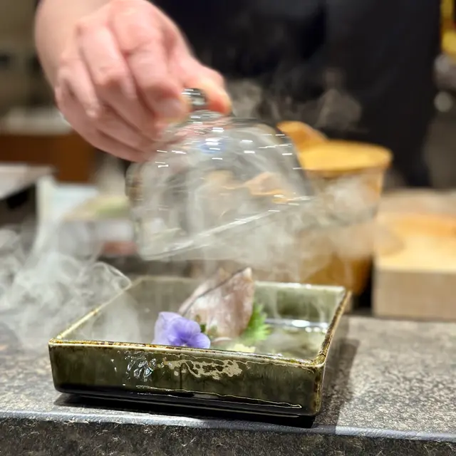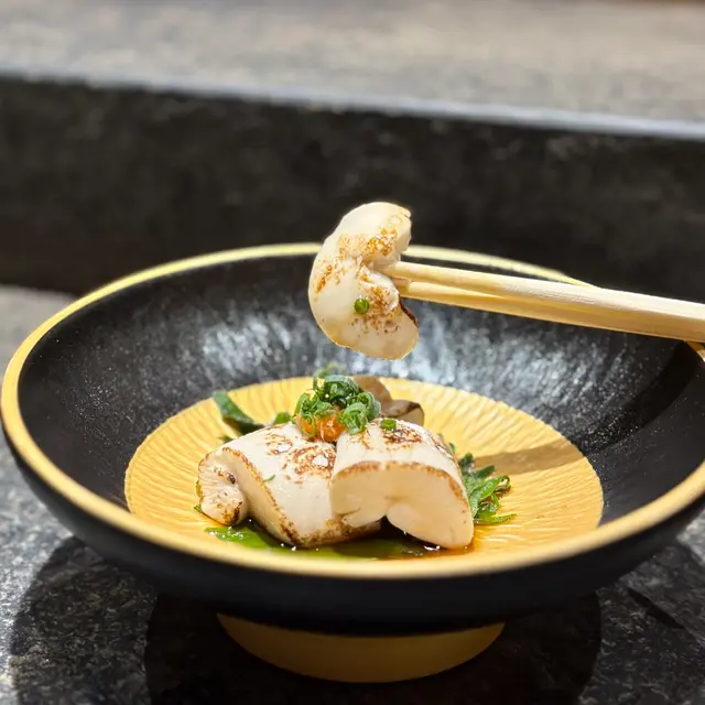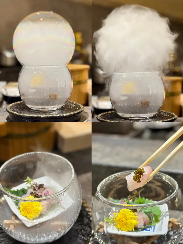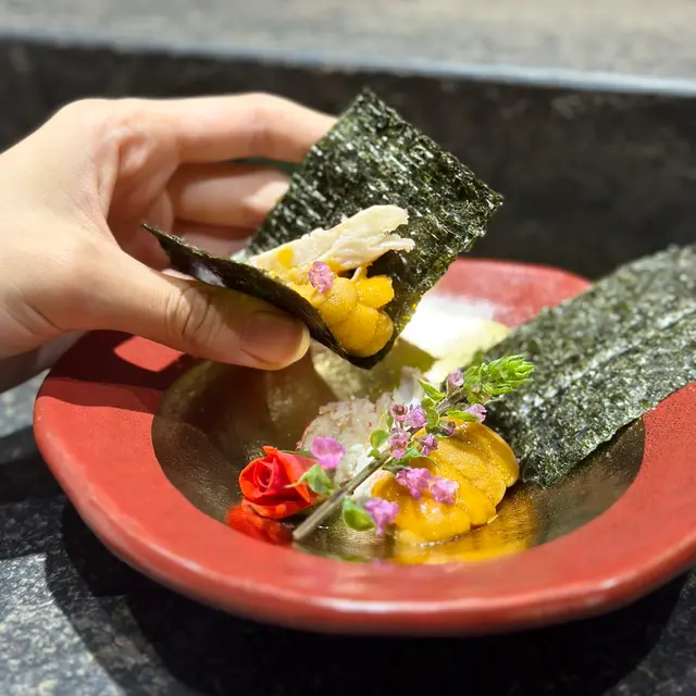 刺身環節見功力:真雕薄切透光,淡雅鮮甜;甜蝦他他拌入蝦膏,濃郁滑順;生蠔海水味清而不腥;烏魚白子以柚子醋提味,入口如奶油化開;毛蟹海膽層層堆疊,鮮味交織;鰹魚表面輕炙,油脂香氣誘人。