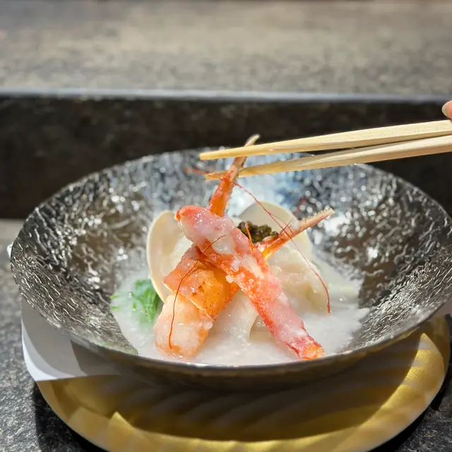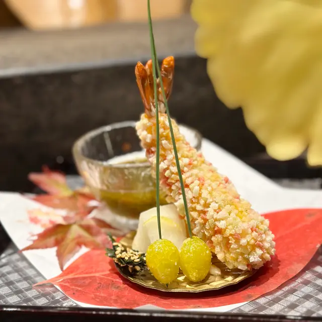 先付以「七色米通炸車海老」開啟,輕脆的彩色米通裹著彈牙車海老,銀杏綿密,醋漬水雲清爽醒胃,三者質感對比巧妙。