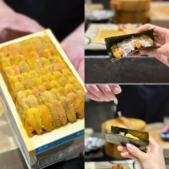 壽司節奏舒暢:伊佐木爽脆、帆立貝甘甜、深海池魚油潤、象拔蚌鮮脆、白蝦晶瑩甜美、地金木鯛經熟成風味更醇、鯖魚押壽司酸度平衡、黑鮭魚味濃厚、大拖羅入口即化。醋飯溫度適中,酸度柔和。海膽手卷用紫菜包裹滿滿北海道海膽,浪潮般的甜味在舌尖蔓延。