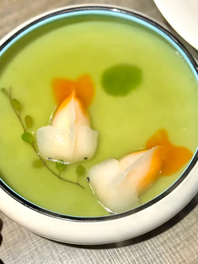 呢個造型100分!透明蝦餃皮薄到透出粉紅蝦肉,浸喺清甜雞湯。蝦肉爽脆爆汁,鮮味double up!