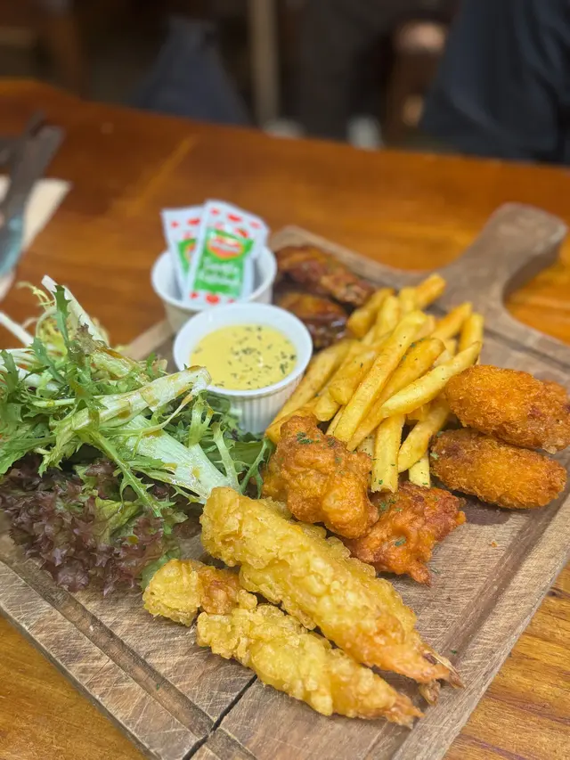 「小食拼盤」包含脆炸雞塊、薯條、炸蠔、炸蝦與雞翼,炸物火候掌握得宜,作為佐餐小品合格有餘。