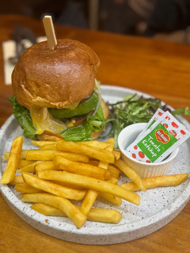 厚切多汁的大啡菇經香煎後散發濃郁菌香,與成熟牛油果的綿密口感相得益彰,融化的芝士如絲綢般包裹著食材,自製漢堡排肉汁豐盈。特別推薦搭配烘底漢堡包,獨特口感令人難忘。