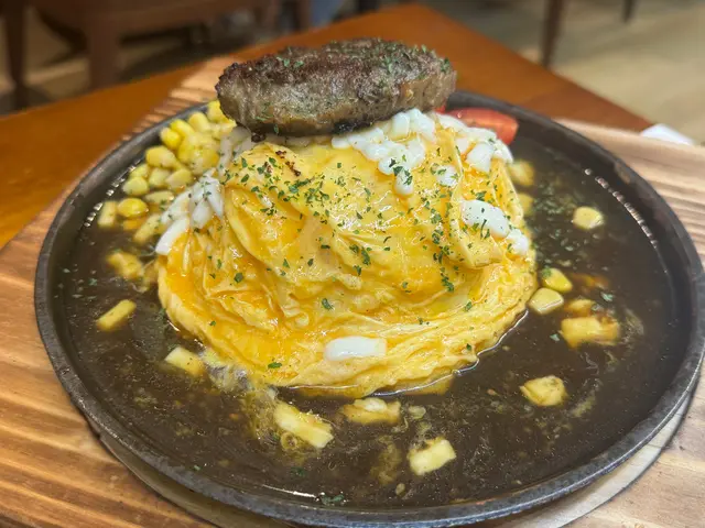 選用油花均勻的飛驒牛製成漢堡肉,肉質細嫩帶有淡淡奶香,與半熟滑蛋形成絕妙搭配。鐵板餘溫讓米飯形成香脆鍋巴,拌入特製醬汁更顯層次。