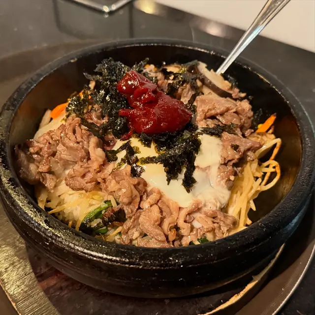 「韓式石鍋飯」石鍋飯上鋪滿了各種新鮮配料,包括牛肉、蔬菜、雞蛋等,搭配特製的韓式辣醬,拌勻後每一口都能感受到豐富的層次感👍🏼 石鍋的高溫讓底部的米飯形成香脆的飯焦鍋巴🙌🏻