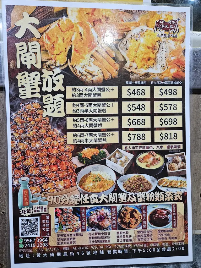 如果想享受更豐富體驗,加$200就可以升級90分鐘豪華放題!除咗清蒸,大閘蟹更有鹽焗、避風塘、荷葉花雕蒸多款煮法選擇。蟹粉菜式更加豐富,包括:
