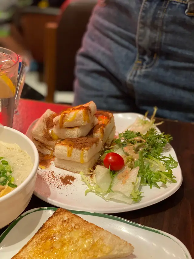 熱量炸彈🫣但是好味🤤不過唔知點解要係旁邊配沙律,味道方面兩者之間完全唔配😂雖然他美綠粉和煉奶給的不少,但是感覺包身再烘一烘會更加好食,依家食落口太淋,雖然係吸到美綠粉和煉奶的味道,但口感差咗少少