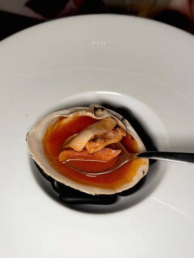 手掌般大的生蠔與酸甜的蕃茄啫喱形成強烈對比,讓味覺更加多元。生蠔鮮甜飽滿多汁🦪