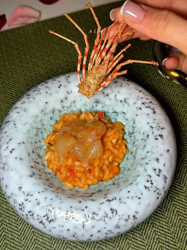 海鮮湯熬煮的意大利飯,鋪上日本刺身牡丹蝦,蝦頭炸至金黃酥脆,鬆軟煙韌飯粒與酥脆蝦頭完美融合,口感多變🦐