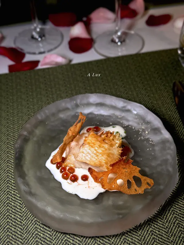 甘鯛以日本立鱗燒技法製作,魚肉雪白肥美,醬汁方面配合法式奶油醬與鮮美的三文魚籽,奶香濃郁