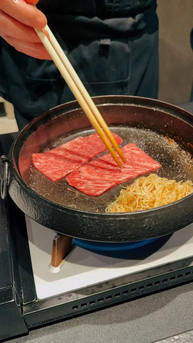 師傅先用牛油熱鍋,灑日本和三盆糖煎香和牛,甜香攻鼻到流口水!🤤