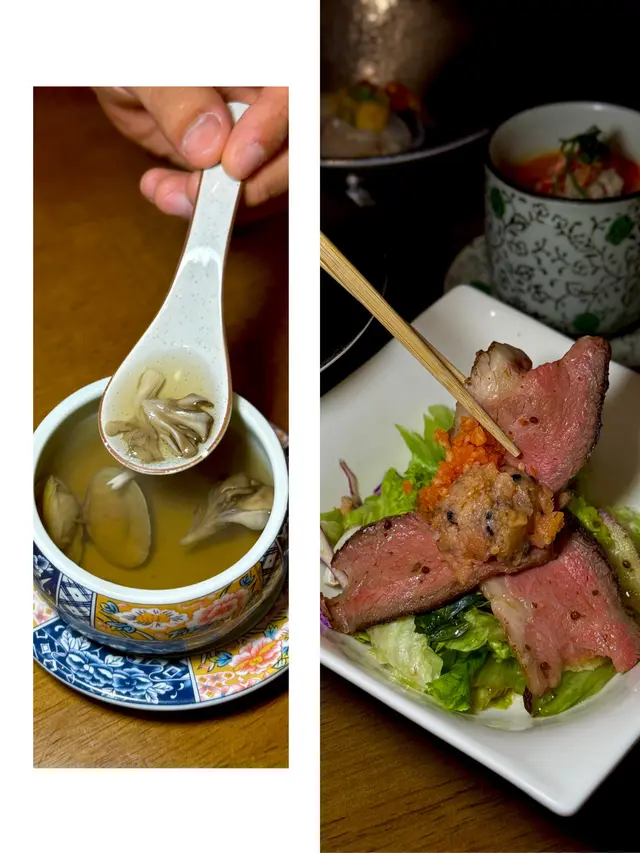 ❶ 前菜𝟏~三文魚蓉配和牛片沙律,簡單之餘不失奢華