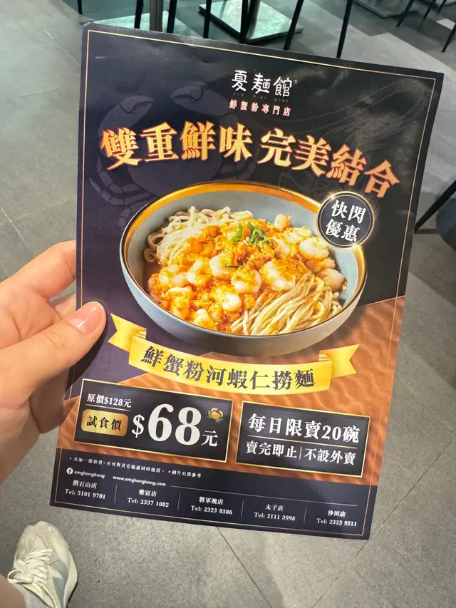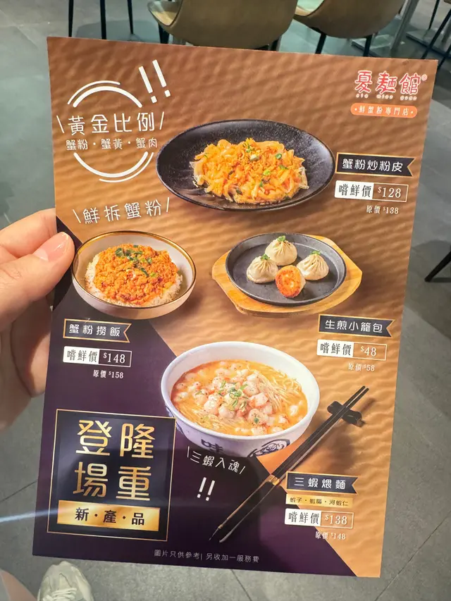 【鮮蟹粉河蝦仁撈麵與蟹粉小籠包|午市套餐優惠必試】 Moni85等級42025-04-19312 瀏覽 關注 【鮮蟹粉河蝦仁撈麵與蟹粉小籠包|午市套餐優惠必試】 每日限量20份的「鮮蟹粉河蝦仁撈麵」,金黃蟹粉,鋪滿河蝦仁,每一口都能嚐到蟹粉與蝦肉,拌上細麵,鮮味層次分明。另一招牌「蟹粉小籠包」外皮包裹豐盈內餡,一咬爆出蟹粉湯汁,搭配薑醋提鮮,滿足一下蟹粉癮。 午市時段更推超值套餐,性價比極高。二人套餐有兩個小食一個主食,兩個前菜,一個小食。雞扒炸得酥脆,配上濃郁嘅擔擔麵,係一個唔錯嘅選擇。醬鴨惹味,鍋貼小籠包也是紮實的感覺。這裏座位寬敞,店員服務態度友善,是一間性價比份高的餐廳。以上食評乃用戶個人意見 , 並不代表OpenRice之觀點。1分享【鮮蟹粉河蝦仁撈麵與蟹粉小籠包|午市套餐優惠必試】 夏麵館 (新都城中心二期) https://s.openrice.com/QrbT07wDR00檢舉 張貼 評分5味道5環境5服務4衛生5抵食用餐途徑堂食