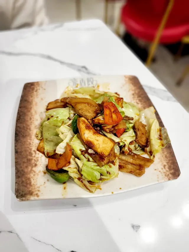 五花肉肥而不膩,肉質鮮嫩,佐以青紅椒及椰菜,口感豐富。