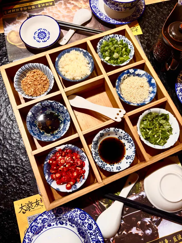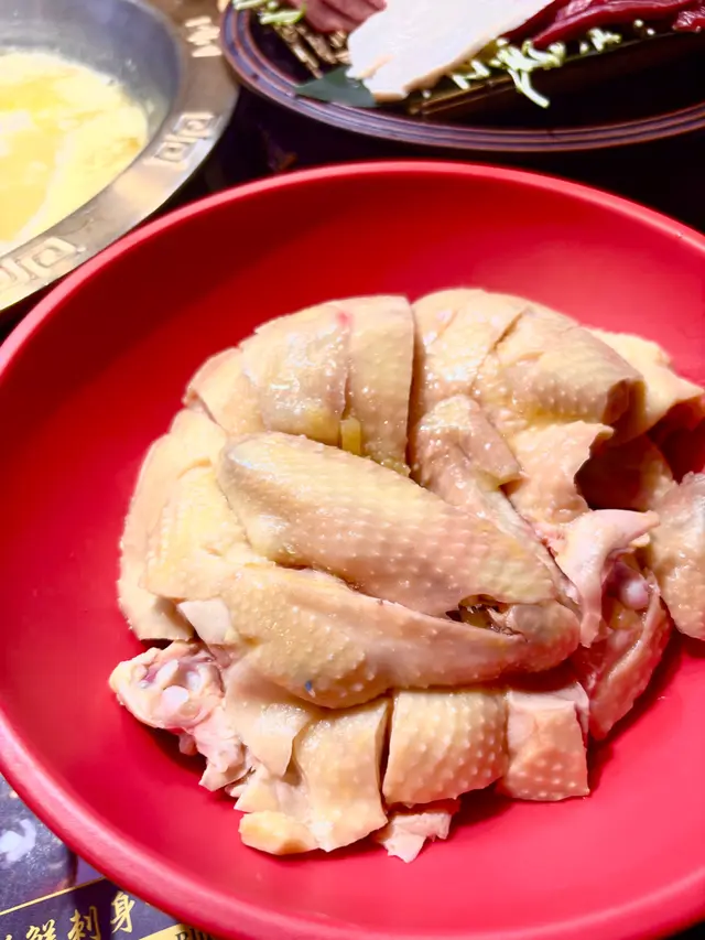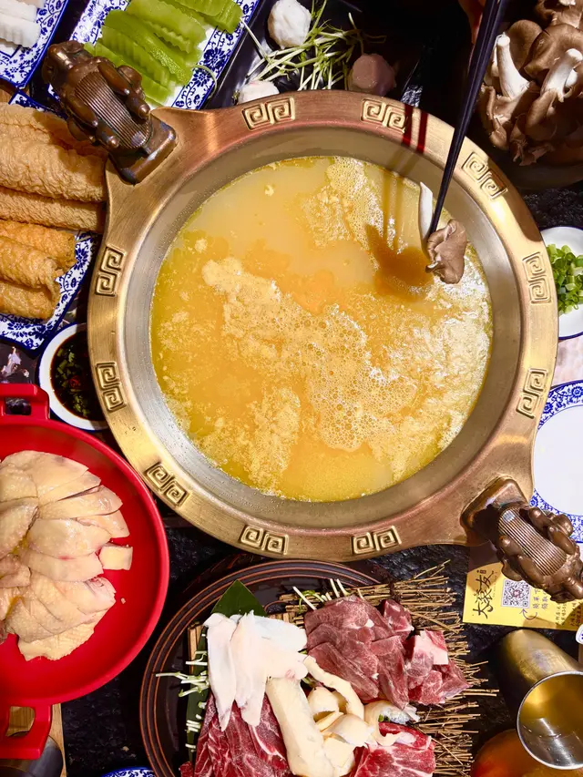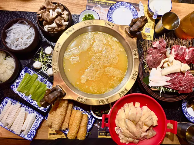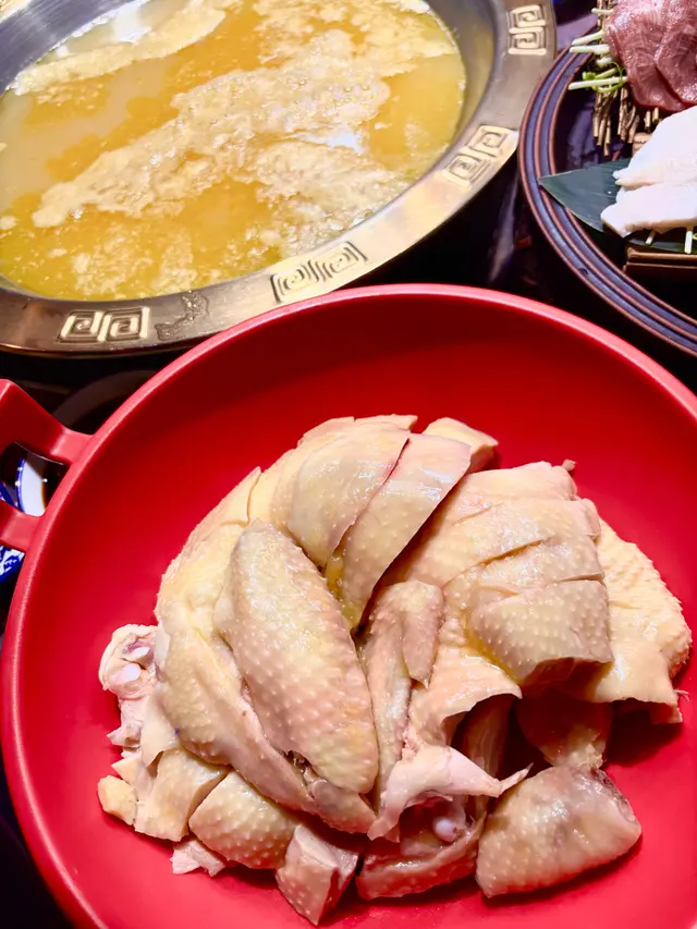 湯頭熬成奶金色,勺起時能拉出絲綢般膠質。厚切花膠彈牙飽滿,雞肉輕輕一抿立即骨肉分離。建議先喝兩碗原湯,再開始涮食材!