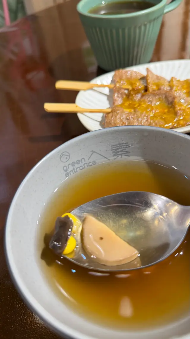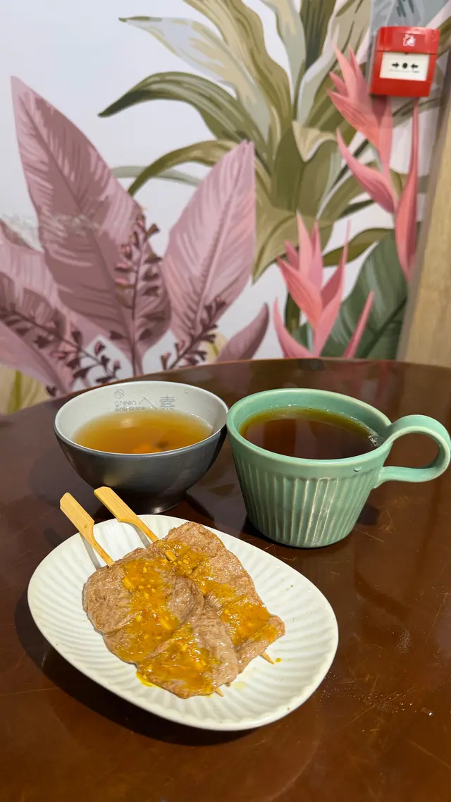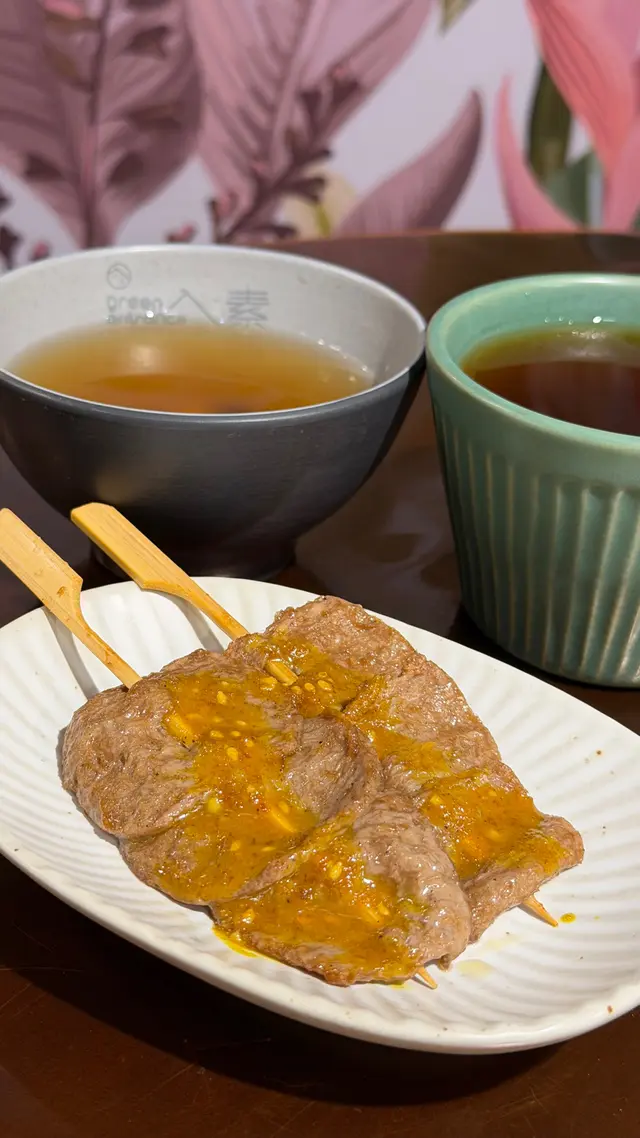 用竹簽串起,外型神似甚有喜感,沙嗲醬汁有少量芝麻,味道甜甜香香,素牛肉肉紋分明,味道少少惹味。
