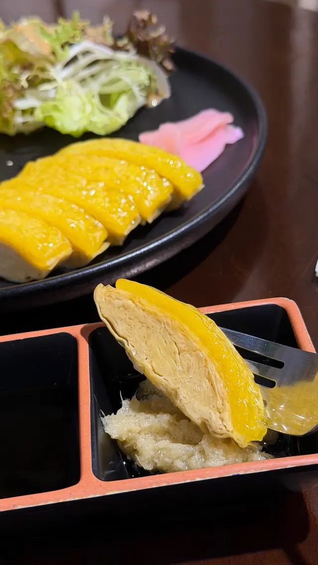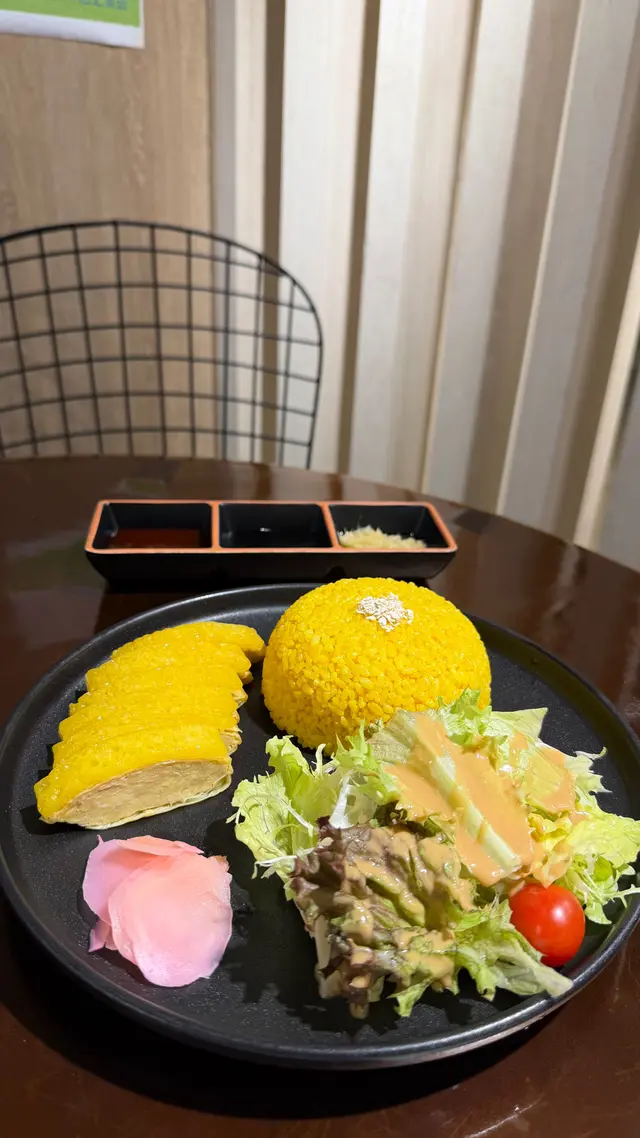 必食鎮店之寶,雞肉外型像真度高,雞肉用了豆皮,雞皮尤其神似,軟身又帶點煙韌,造出雞皮的真實感,平時「走皮」的朋友絕對可以放心食!海南雞碗上大大碗黃薑飯,有少飯,多飯供選擇,亦備薑蓉、黑油、豆瓣醬。