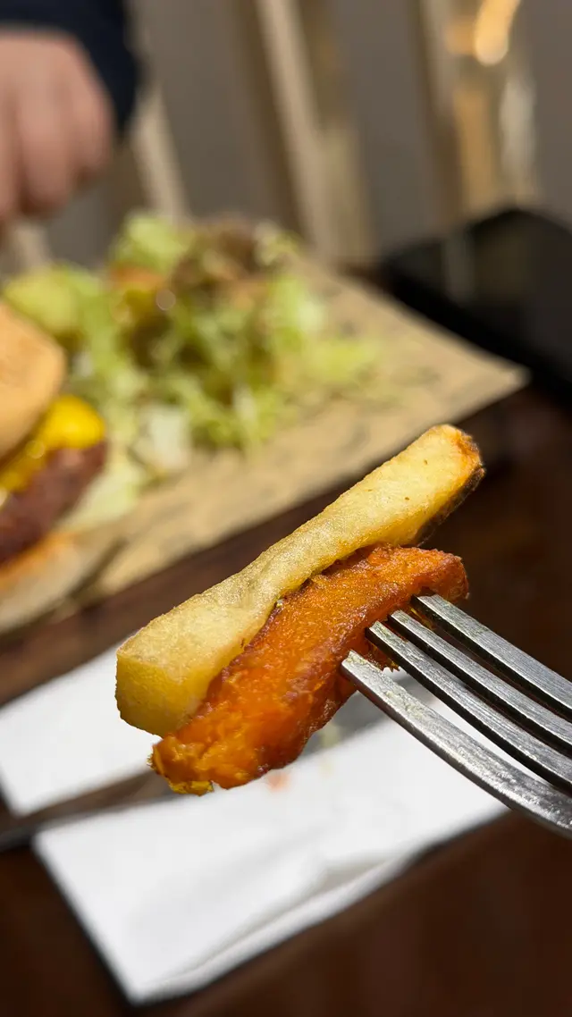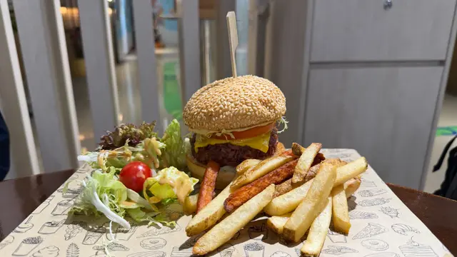 廚師手造素漢堡,肉質較乾身但有肉絲質感,沙律菜、薯條蕃薯條炸得出色。