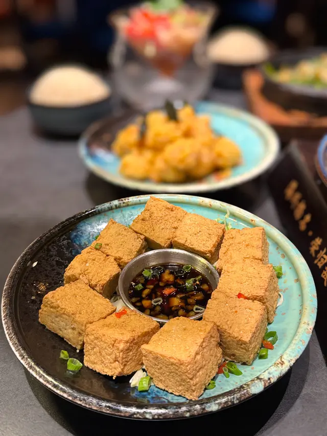 板豆腐炸至金黃酥脆,口感外脆內嫩,外層帶有椒鹽嘅鹹香,內裹係豆腐滑溜細膩口感,再點上醬汁黎食,好惹味。