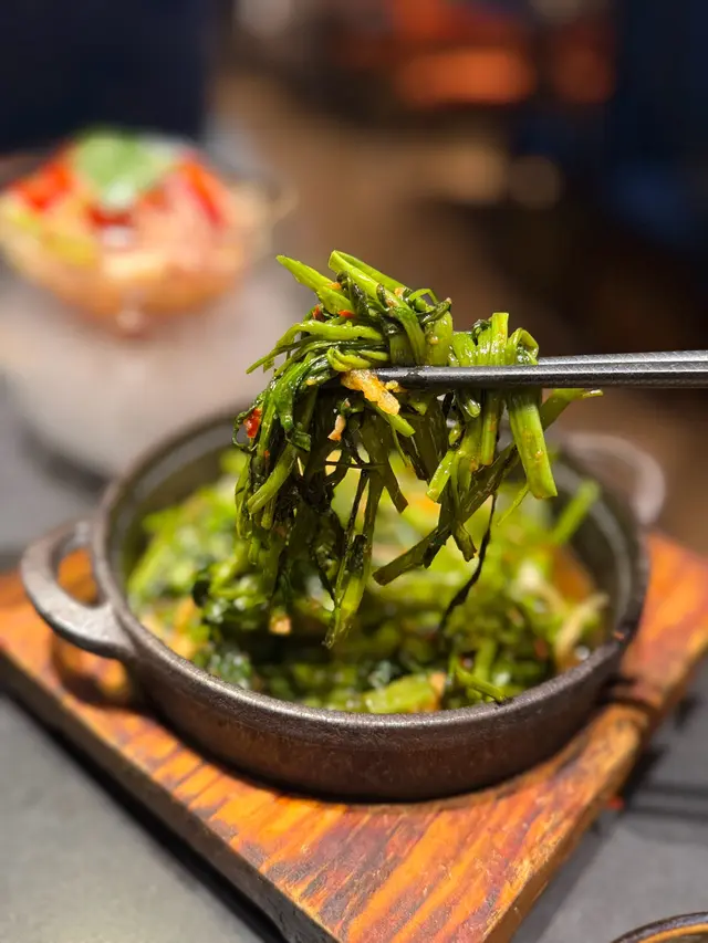 翠綠嘅通菜用上惹味濃郁嘅森巴辣椒醬去炒,味道帶微辣惹味,口感爽脆,惹味得嚟仲好夠鑊氣,再加上蝦米去炒好香。