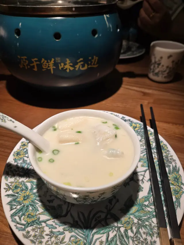 招牌名菜,豆漿湯底,鮮魚片、竹笙、蕃茄、魚丸及豆腐,材料豐富,豆漿密度高,口感軟滑。