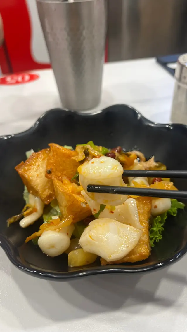 墨魚鬚粗過飲筒,彈牙爽脆,魚片頭切得丁方,細細粒易入口,配上麻辣汁,同店名一樣「辣得喜」