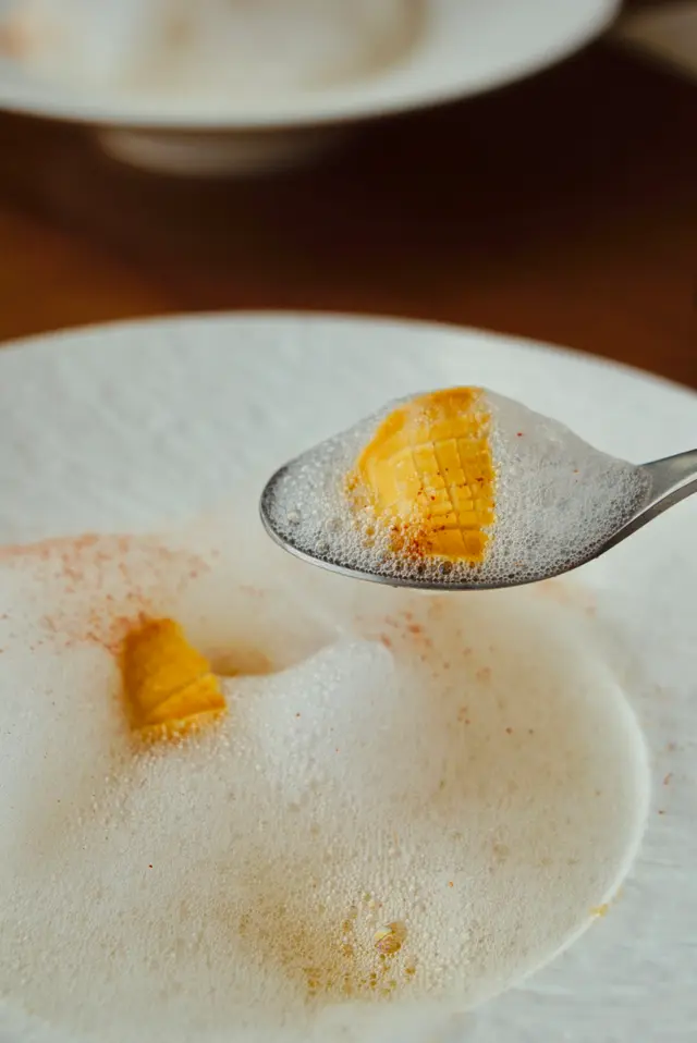 以自家大米、韓國時令蔬菜、韓牛和新鮮蜆肉用十五小時熬製而成的粥,甫上菜就嗅到麻油香撲鼻而至,入口先嚐到濃郁麻油味,再有菜莖、蜆肉和韓牛不同層次的口感。經過十五小時的洗禮後,大米熬成綿綿的粥底和其他食材融為一體;而裝飾的米紙即是另一口感的存在,脆脆的像韓國米通,蘸粥一起吃,一鹹一淡、一脆一綿,正!