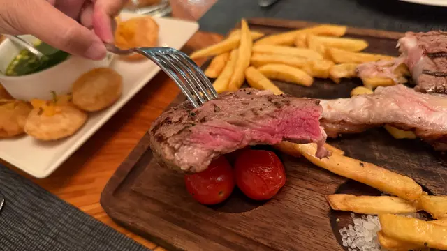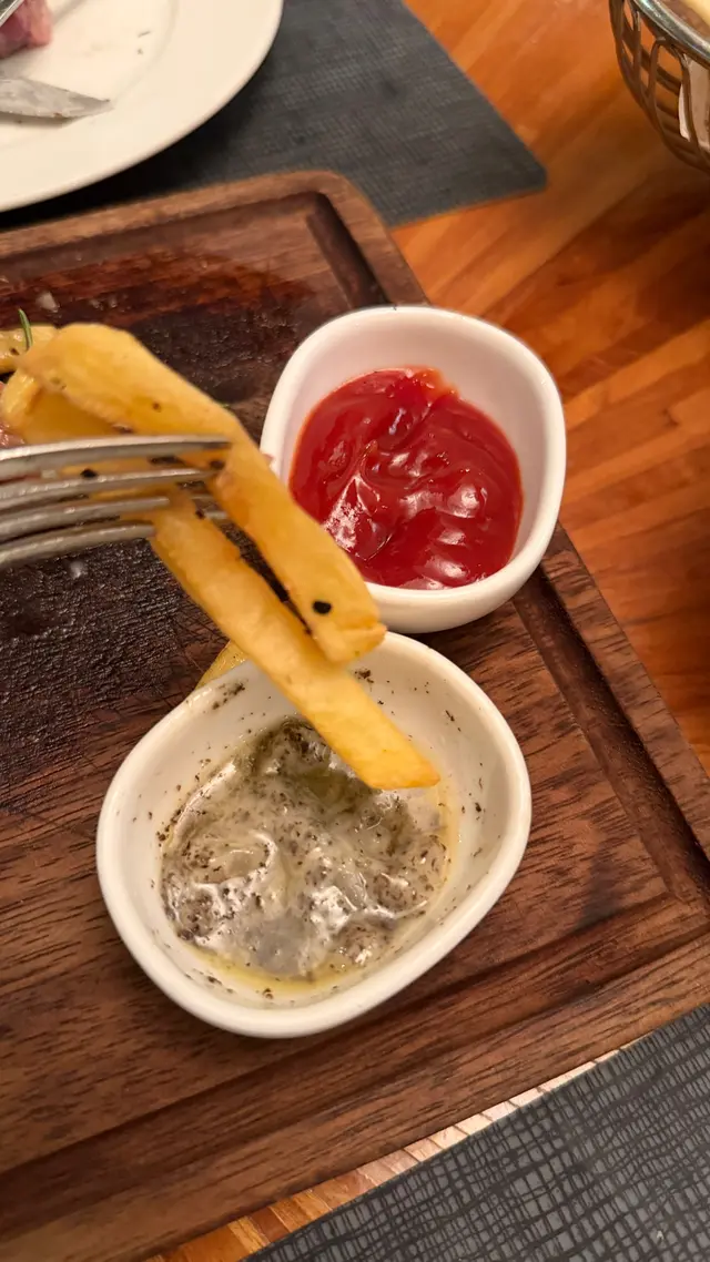 抵食套餐,仲附送紅酒一杯,優惠吸引。西冷我揀選medium rare 約4-5成熟,點上粗海鹽,更帶出肉香。薯條炸得金黃香脆,喜愛薯條的朋友有口福了,可無限量添加。
