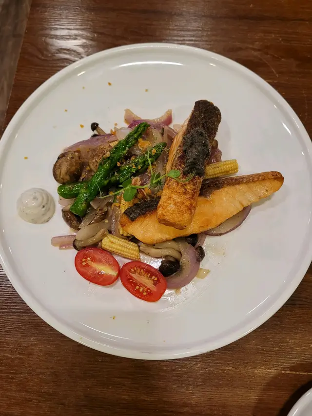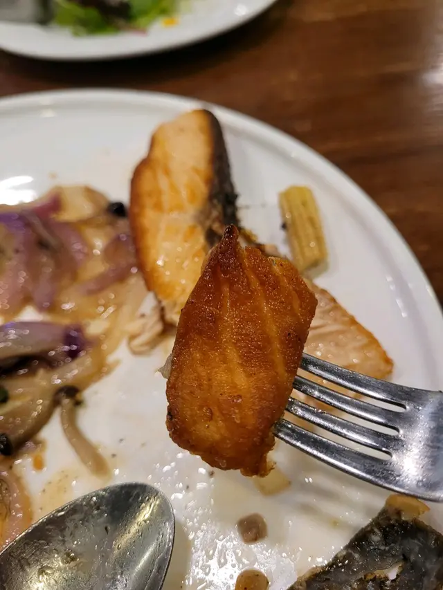 兩塊三文魚柳,煎得金黃,魚皮香脆