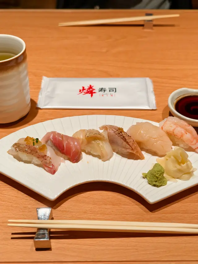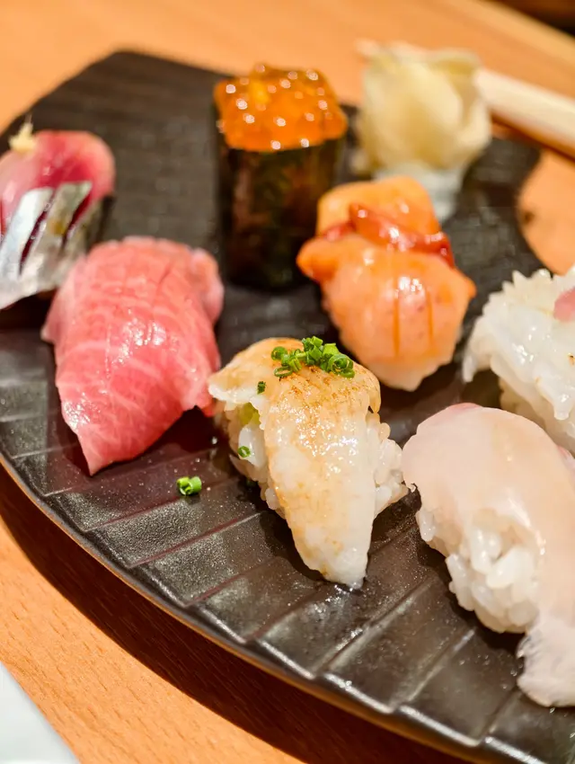 由左至右分別是真鯛,油甘魚,鰝鰈魚,銀鱈魚,帆立貝和甜蝦,每款都非常新鮮,部份經過火炙味道更香濃。其中鰝鰈魚和甜蝦都有驚喜,鰝鰈魚有油香,甜蝦特別香甜。帆立貝大大隻的,軟糯