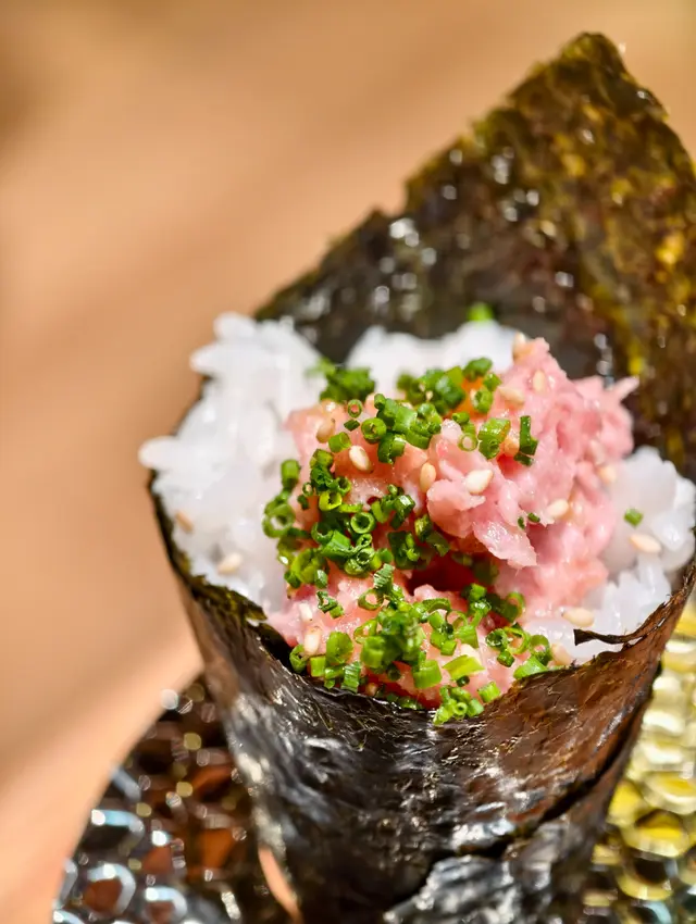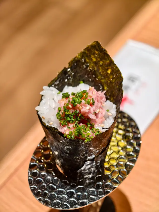 這是吞拿魚蓉手卷,加了點醃蘿蔔來增加口感和解膩,魚味和油香都挺足的,而且大大個。