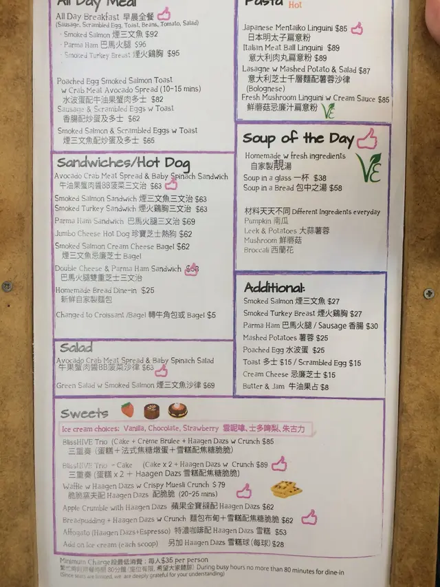 ,除咗麵包西餅外,他們做的有全日早餐、意粉,例如明太子扁意粉和意大利芝士千層麵,配薯蓉沙律也是我的至愛。他們還有三文治及熱狗,三文治不是一般的白面包夾煙三文魚,他們的設計很精美,尤其鍾意他們的牛油果蟹肉醬BB菠菜三文治,有時用竹炭麵包真是頂呱呱。買餐湯加$38另外也可以點青菜沙律或切餅,每逢節日他們也會做一些特色曲奇,今天見到有洋蔥煙肉蛋餅㖭。佢嘅新鮮們包不在話下係好正!亦都欣賞佢哋做早餐,上晝8:30am至11:30am, $35就有一個特色麵包(約值$17)送一杯咖啡㖭,實在是超值之選。