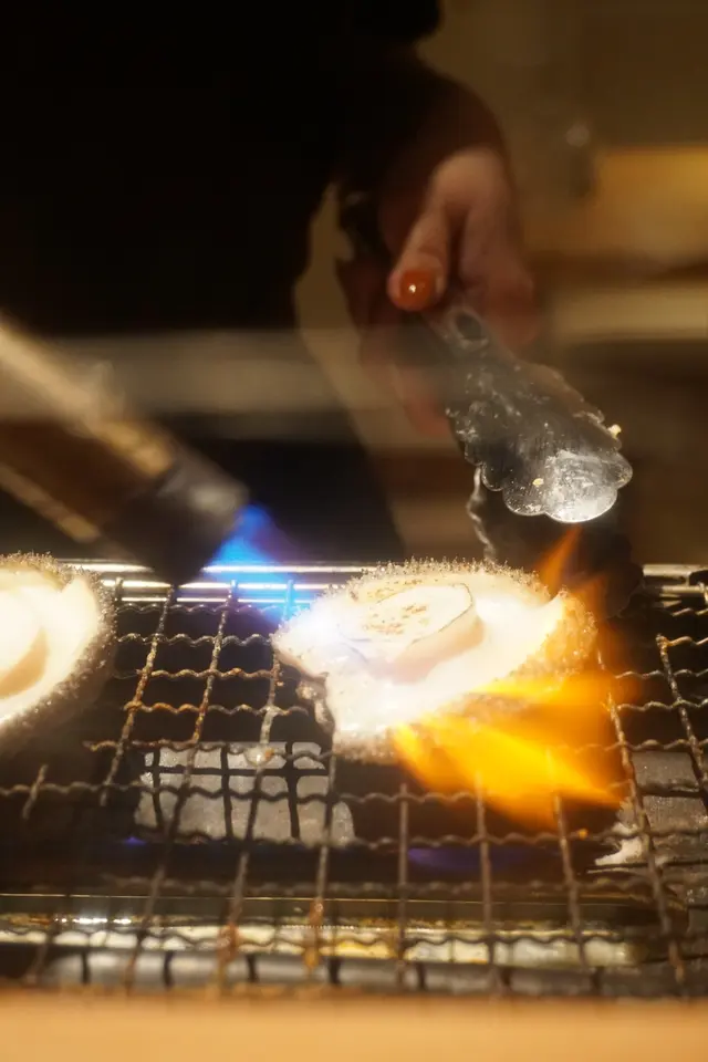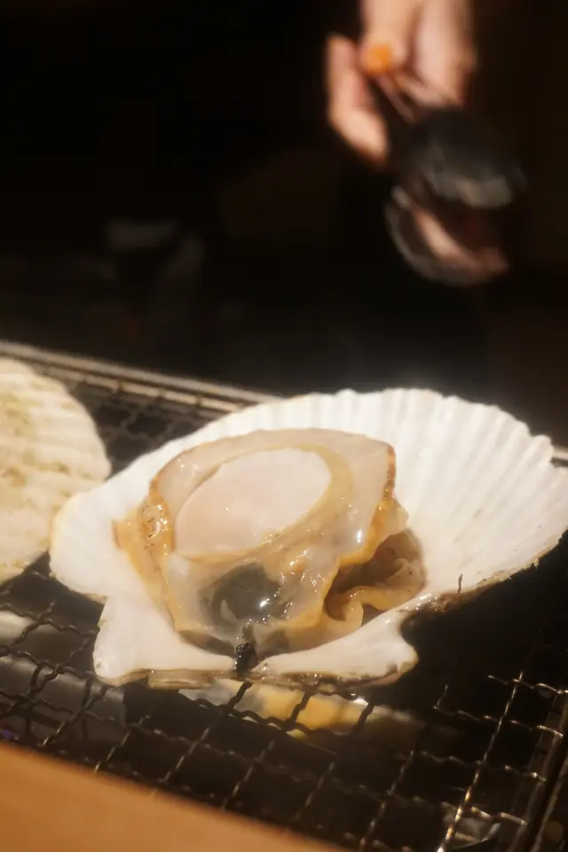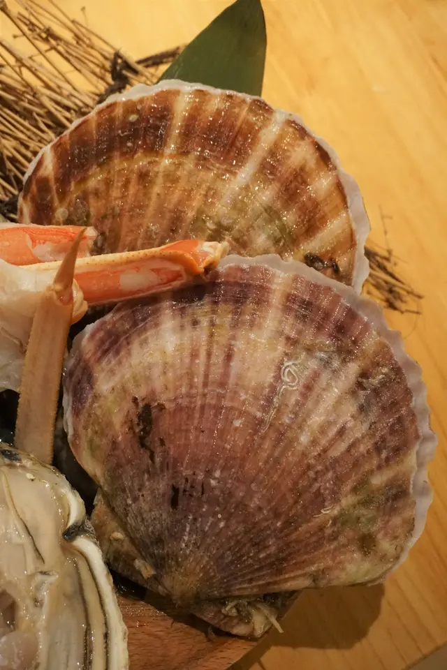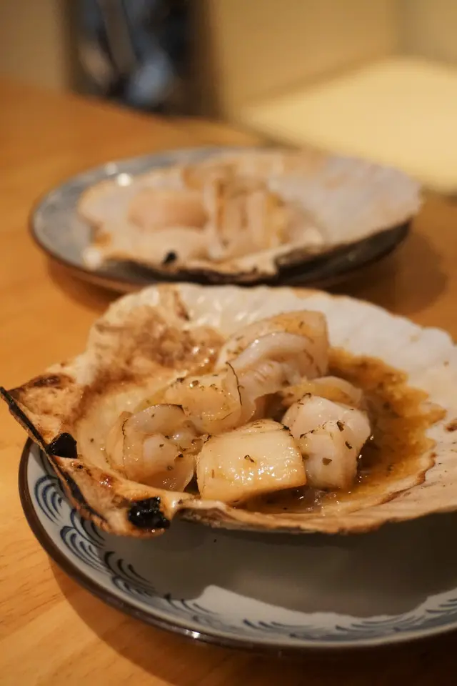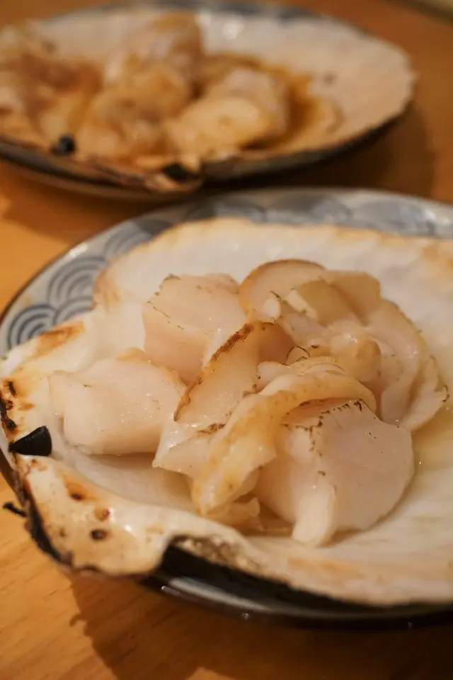活帆立貝: 分別以醬油同清酒做調味; 醬油味道偏濃郁, 鹹香帶鮮; 後者以清酒帶出帆立貝本身鮮香, 滲出淡淡香醇清酒味。