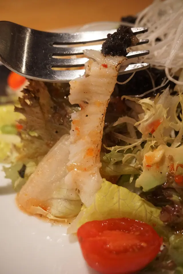 平目魚邊被炙燒過迫出部份魚油, 表面魚油更顯魚質又滑又林; 新鮮爽脆沙律菜、蕃茄仔, 再加咗黑松露、特製醬汁, 撈埋一齊食, 酸酸地, 而且松露味好重, 正!