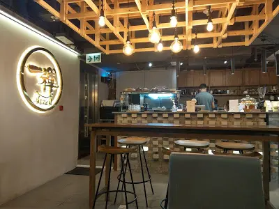 天花板上多個木架構成重複的方形幾何圖形,摻雜垂吊下來的燈泡。
