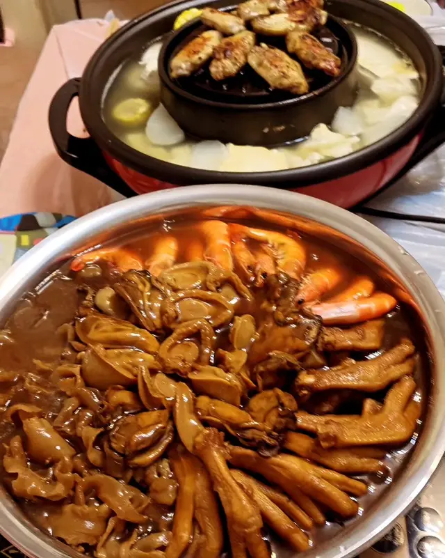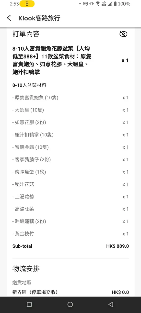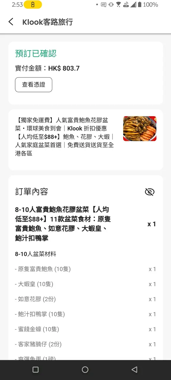 運輸都準時,訂左15:00-16:00,就15:23 到,會打電話叫落樓拎。仲會講聲新年快樂做祝賀。有個紅色保温袋包住,用左幾層保鮮紙包得好密實仲有微温。有2袋汁另上, 淺色d嗰袋係鮑魚汁,深色d嗰袋係花膠冬菇汁,食得出冇味精。店鋪建議唔想咁多汁可以唔到曬既,因為鵝掌之類嗰啲本身已經有味。不過我就照倒曬😈😈😈