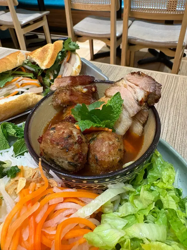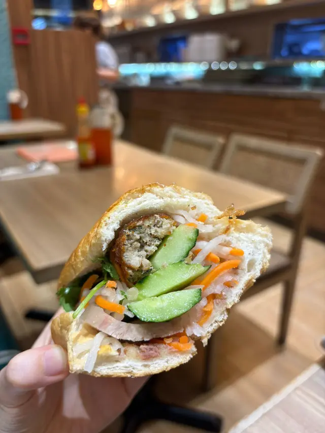 經典越南法包,餐廳有貼心切咗一半,方便食。法包烤得金黃香脆,咬落「喀嚓」一聲。入面嘅烤肉丸好juicy,調味啱啱好,唔會太鹹,加埋爽脆嘅青瓜同酸酸甜甜嘅蘿蔔絲,食落清新平衡。