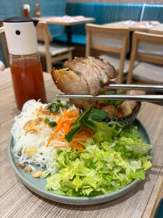 河内烤豬肉伴檬粉,份量大到差啲食唔晒。檬粉爽口彈牙,烤豬肉好香,帶點炭燒嘅煙燻味,肉質嫩滑,唔會太油。配菜有好多新鮮蔬菜,清爽得黎口感好豐富。