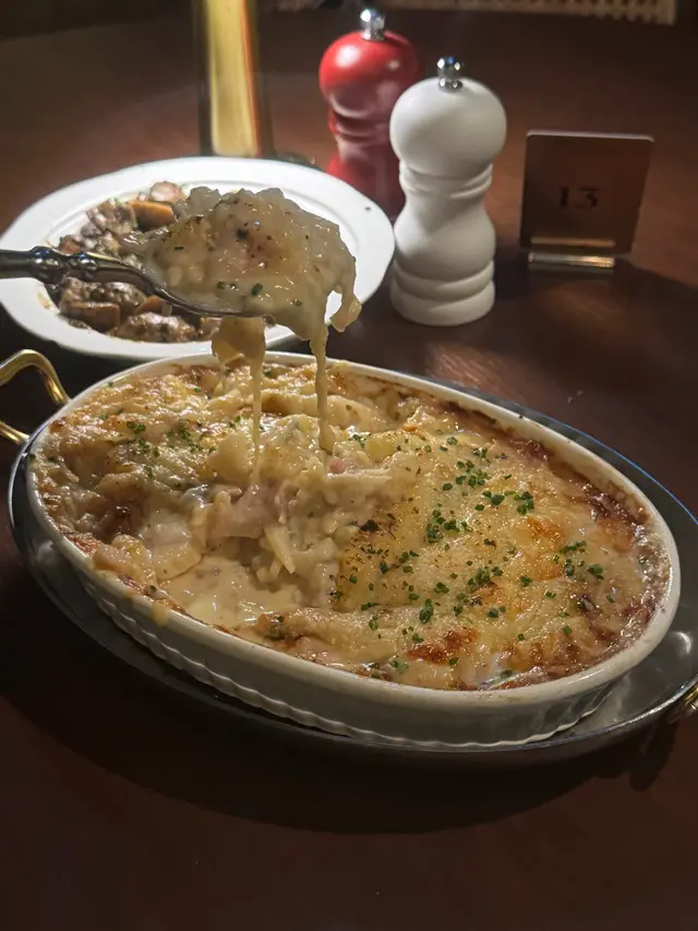 剛剛新出,期間限定嘅冬日菜式,混合忌廉焗薯、煙肉、焦糖洋蔥及Reblochon牛奶軟芝士,有種家常菜嘅感覺🥰表面焗至金黃焦香,盛菜嘅時候見到滿滿拉絲芝士好吸引,食落芝士嘅奶香好突出,薯仔片層層相間,夾住鹹香煙肉、香甜洋蔥及濃郁奶醬,好邪惡😈