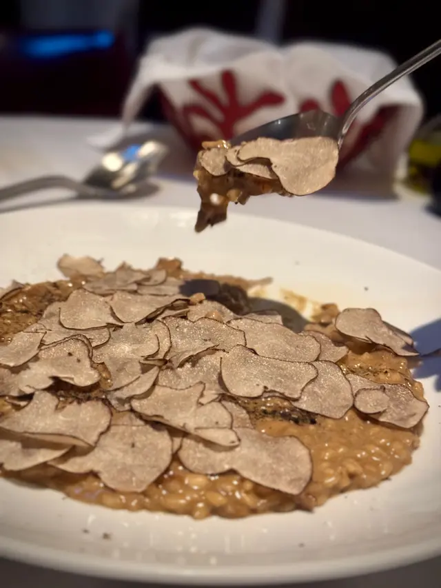 奢華享受!片片黑松露鋪滿在意大利飯,飯粒吸收了高湯精華,非常鮮味,混入松子和雜菌,口感相當豐富,每口也充滿了松露香