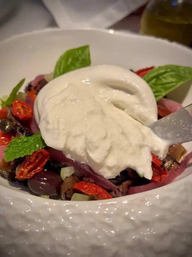 Apulian Burrata Served on Sicilian Caponata, Basil and Oregano