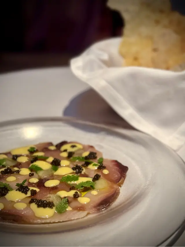 薄片油甘魚刺身配上魚子醬、香橙、青檸及青瓜,醬汁起了提鮮作用,令油甘魚鮮味更突出