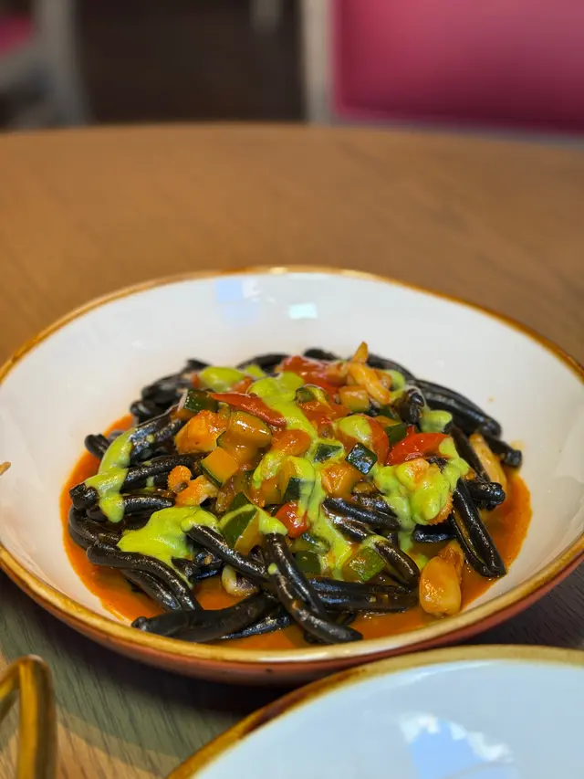 我哋叫咗兩款手工意粉,黑松露細扁麵用咗油封紅蔥牛油去煮,油香滿滿,上面仲有即刨嘅黑松露片🥰墨魚汁麻花捲義大利麵配料好豐富,重點係呢款意粉超級掛汁,每一啖都食到清新嘅羅勒醬同檸檬汁😋