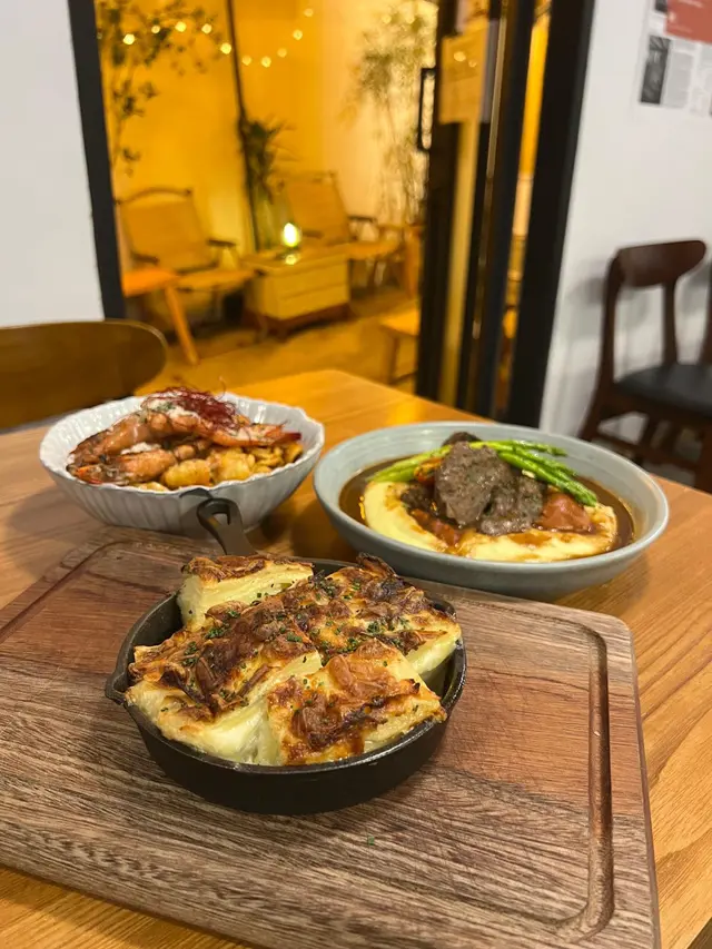 法式焗薯係一層一層嘅薄薯再加白汁焗成🥔冇刀切會比較難處理呀🤣不過好Creamy好正!蒜香白酒煮蜆配脆多士嘅辣味好足🌶️虎蝦貓耳朵朵伴自家熬製龍蝦汁真係勁大陣龍蝦嘅味🦞每粒粉都有😋貓耳朵口感又彈牙~紅酒燉澳洲牛面頰肉配薯蓉嘅牛好軟腍🐮佢呢道菜好啱懶人食😂差唔多全部唔使咬咁🤌🏻尤其係蘿蔔🥕流心比利時黑朱古力撻🍫🥧勁鍾意呢個tart🤩真係流心㗎🙊仲要食落唔會好甜勁正🌟