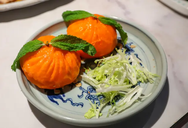 吃主菜之前先試幾款點心,點了其中七款,包括:黑芝麻豆沙包(黑)、太子参帶子餃(白)、紅菜頭素餃(紅)、咸柑桔生煎包(橙)、菊花蝦餃(黃)、翡翠蘆筍餃(綠) 及 太史蛇羮酥(金黃);所有點心的顏色也和認知有所出入,原來大廚刻意把一些健康食材如黑芝麻、紅菜頭及蘆筍等添加入傳統點心之中,保持傳統口味之餘也能將營養價值提高。