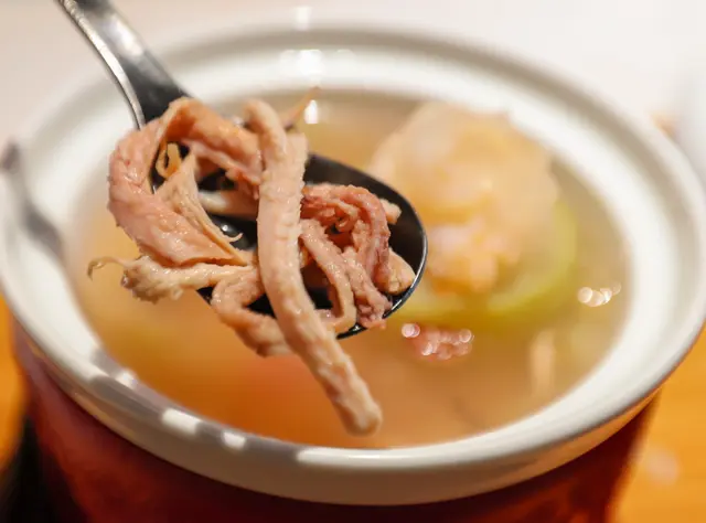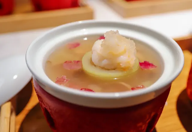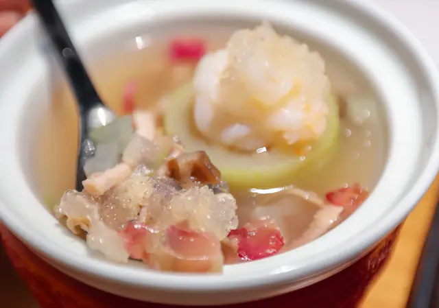 蛇湯以蛇骨、雞肉、豬肉等新鮮食材熬煮多個小時而成,營養價值豐富,節瓜裡頭釀入了帶子、蝦仁、瑤柱和生熟薏仁等食材燉煮 2至3 小時;再加潤肺養顏的燕窩;女士們的大愛!