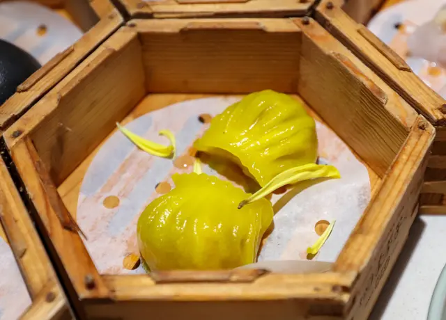 加了菊花的餃子皮呈淺黃色,帶淡淡花香、蝦肉鮮爽,頗清新。