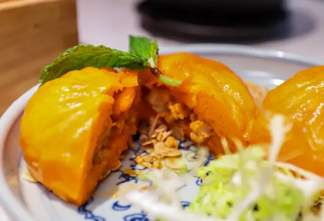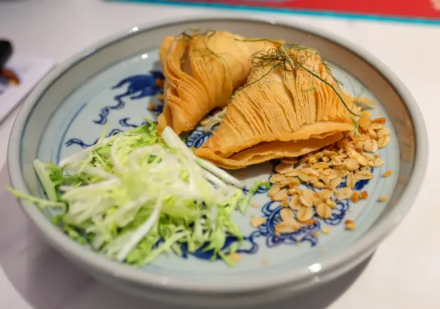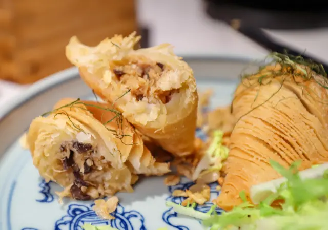 大廚將蛇王芬最出名的名菜蛇羹 - 凝固成啫喱肉凍,以酥皮包起並炸至金黃香脆,不但保留蛇羹的原汁原味,更可以用手拿著逐口品嚐,創意與味道兼備。
