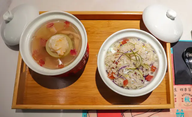 這個春夏限定全新菜式有兩款,包括:「燕窩蛇湯海鮮節瓜套餐」及「桂花桃膠雪耳燉原個雪梨」;前者包括有燕窩蛇湯節瓜盅及蛇王芬臘味蟹肉蛋白炒飯。
