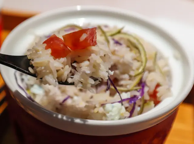 炒飯粒粒分明又夠乾身,配上惹味的臘味粒及鮮嫩的蟹肉,味道清爽不過膩;紫椰菜及陳皮絲不但令食物層次更加豐富,且更有效減低油膩感。