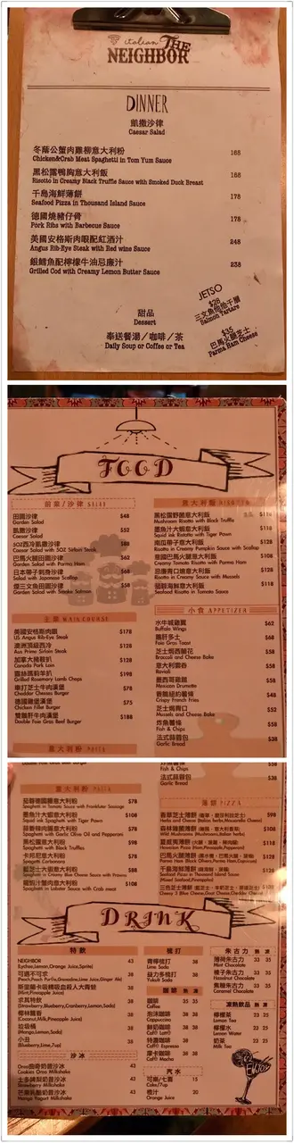 Menu簡單清晰:Set Dinner包頭盤、主菜、甜品、餐湯/餐茶,定價由百幾至三百以內,肉類有齊雞、鴨、豬、牛、魚,烹調還有pizza、risotto及spaghetti,任君選擇,最重要價錢合理,並不進取。加少少錢就可以試到特色小食。